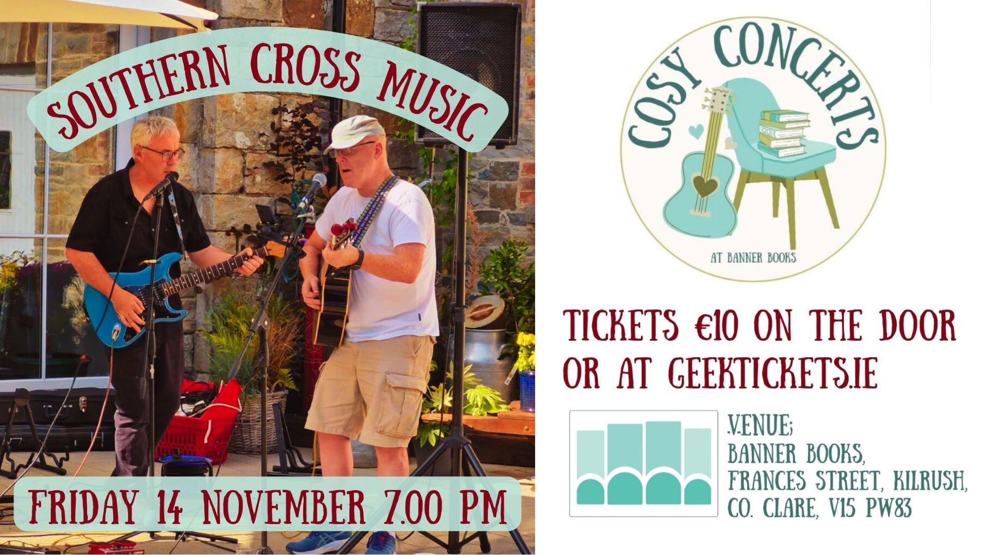 A Cosy Concert with local folk and country duo Southern Cross Music at Banner Books, Kilrush. These intimate acoustic concerts give audiences an opportunity to really connect with the performers, … Continue reading "Cosy Concert with Southern Cross Music"