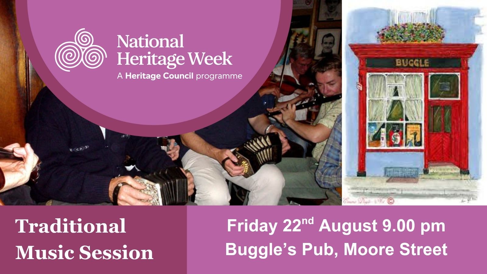 Join the regular musicians at Buggle's for the Seisiún - traditional music in a very traditional setting. All musicians welcome.